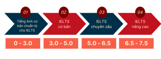 Hệ thống các khóa học IELTS được phân làm 4 giai đoạn, theo trình độ từ thấp đến cao, giúp học viên cải thiện cả 4 kỹ năng Nghe, Nói, Đọc, Viết.